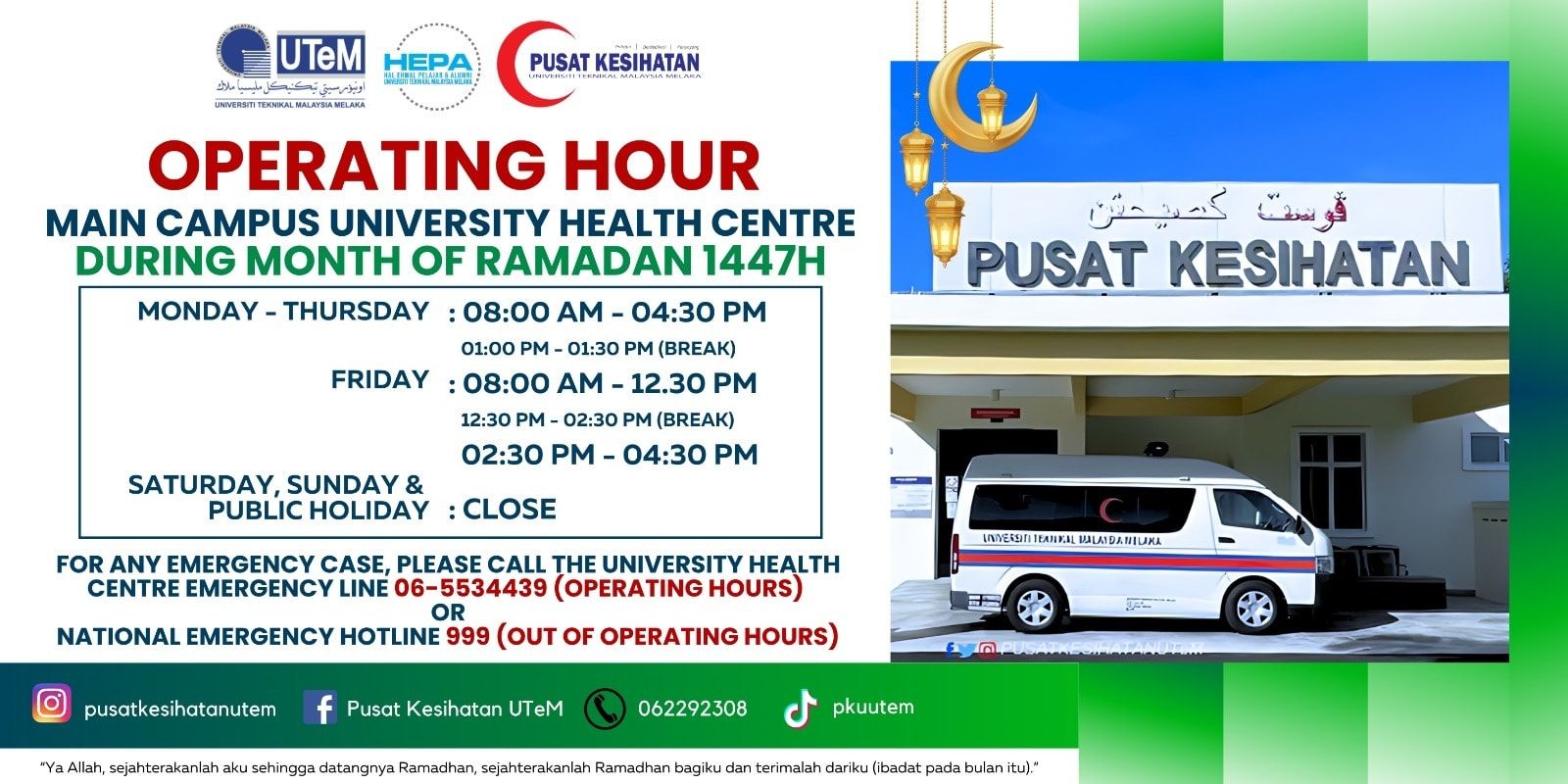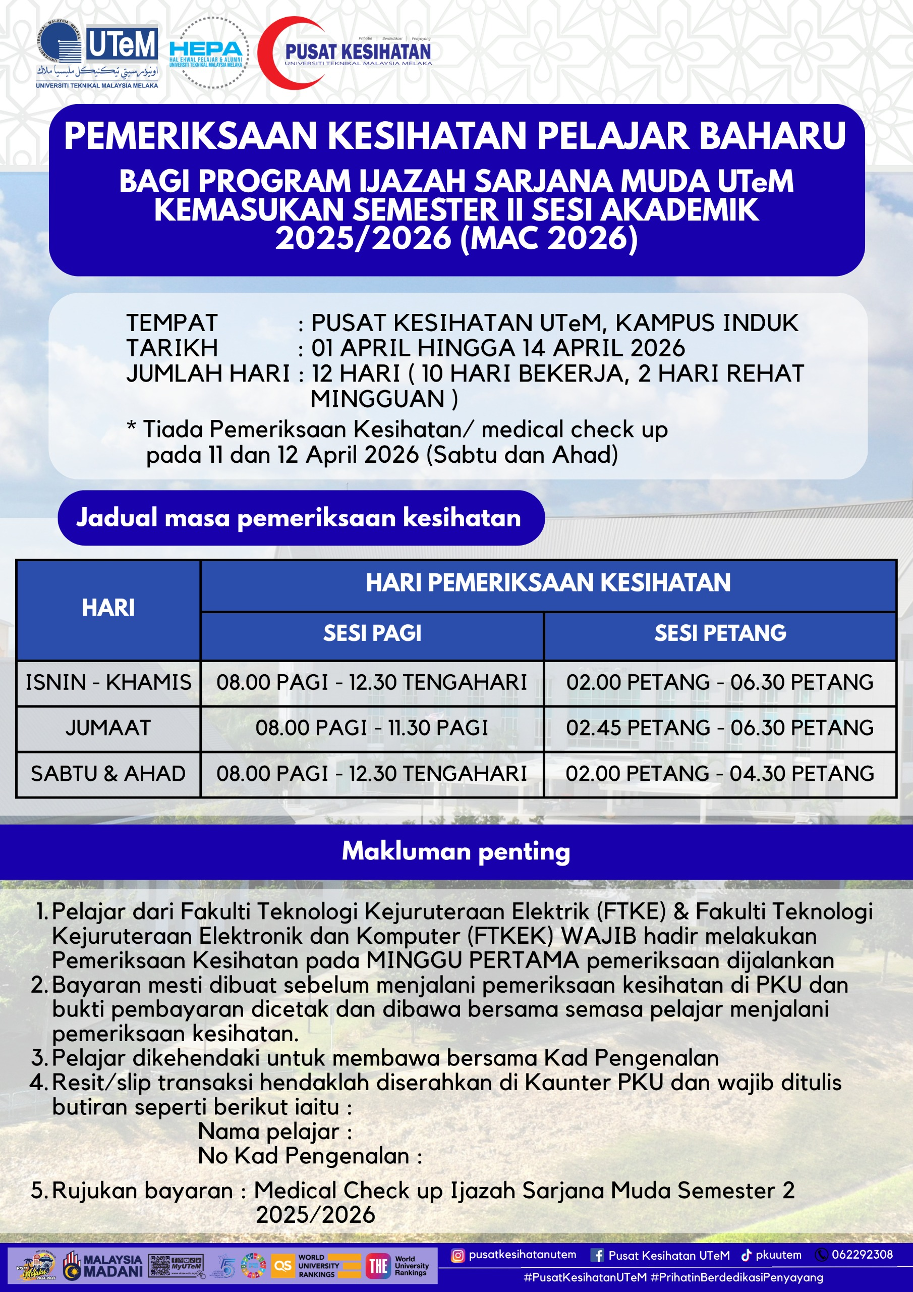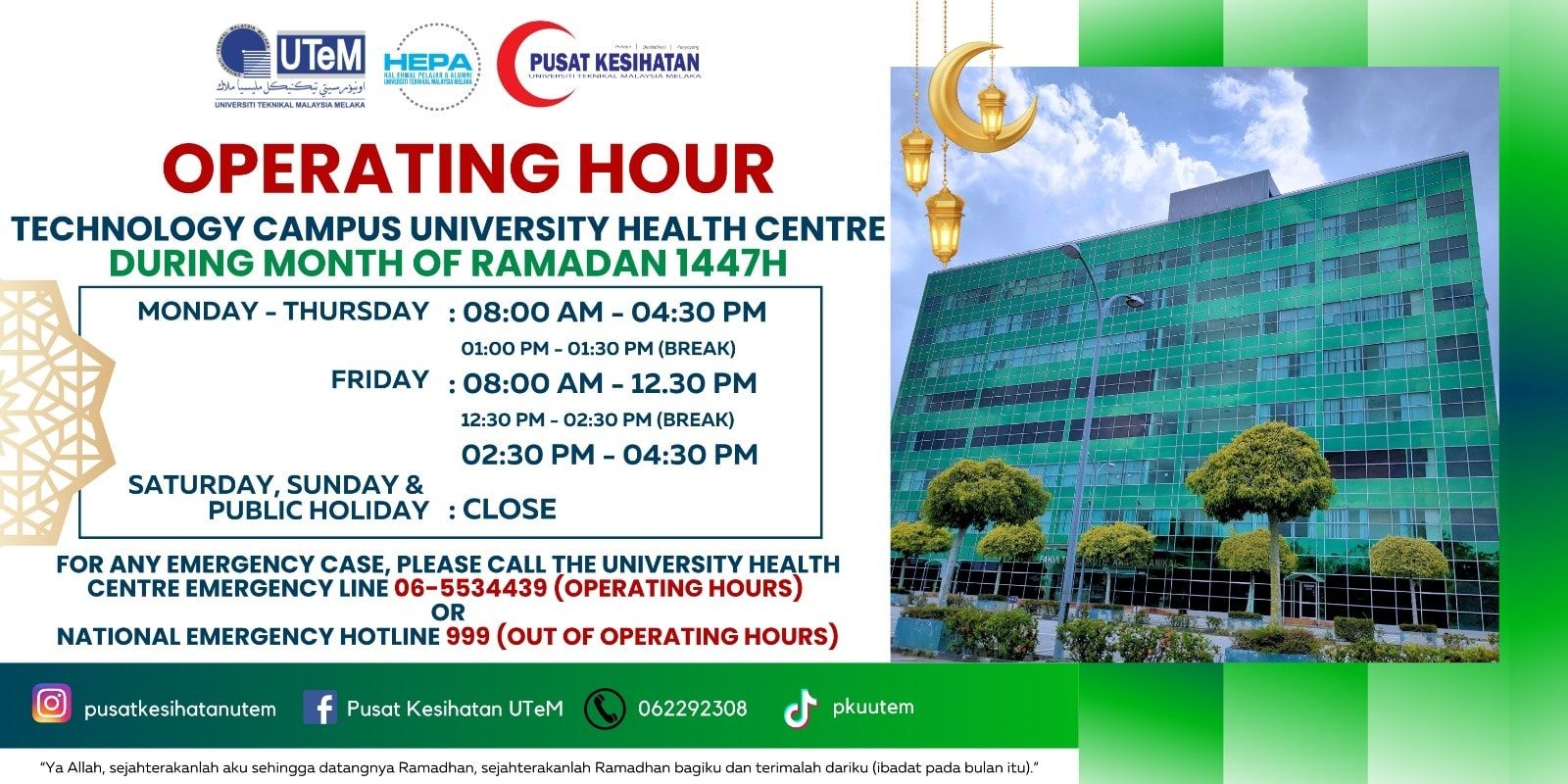 Pusat Kesihatan UTeM Campus Technology Operation Hours